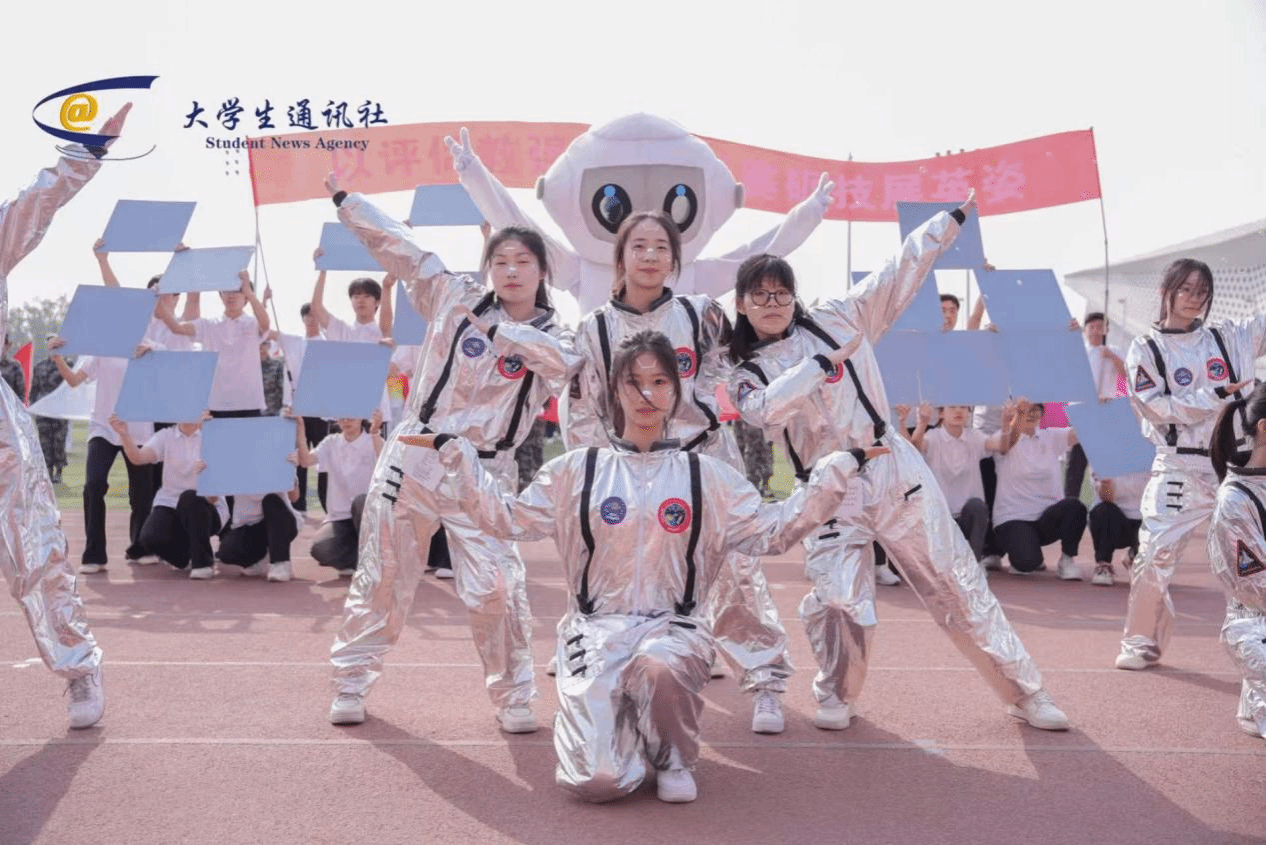 的方阵队伍中:VR眼镜闪耀科技光芒,虚拟与现实交织间投射出"AI"全息图腾。整个方阵科技感与青春感交相激荡,虚实交融间尽显信息学子开拓创新的时代风采。