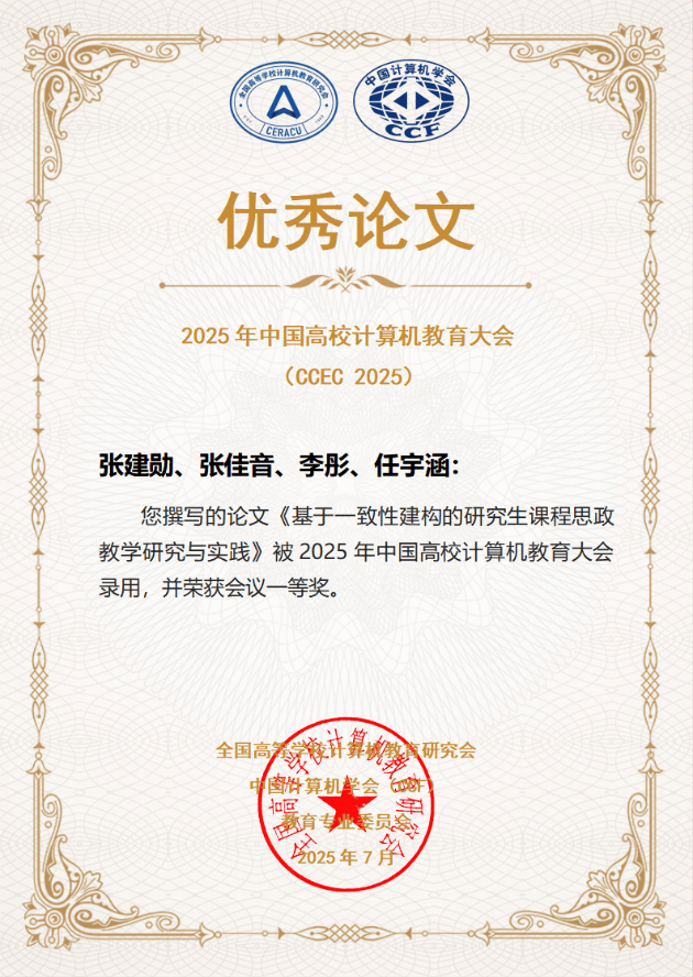 近日, 2025年中国高校计算机教育大会(CCEC 2025)在银川成功举办。本次大会上,学院张建勋和陈静分别撰写的两篇论文荣获2025年中国高校计算机教育大会(CCEC2025)论文一等奖,彰显了韩国漫画