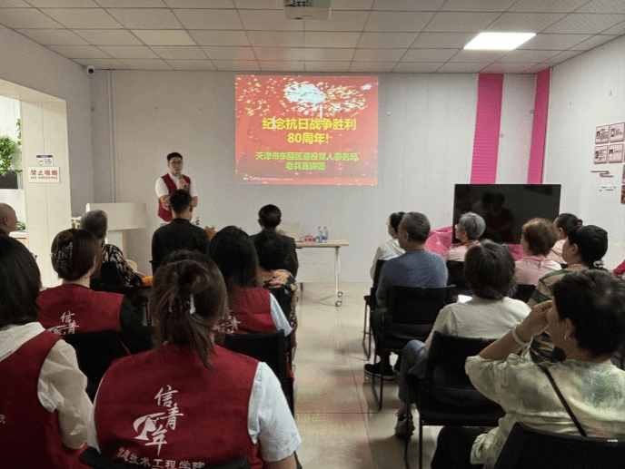 本科生第四党支部深入天津市河东区人民政府富民路街道社区,联合开展了主题为“勿忘国耻缅怀先烈,牢记使命吾辈自强”的宣讲活动,和社区居民一起聆听了“天津市老战士宣讲团”成员、东丽区退役军人事务局“老兵宣讲团”副团长梁春道同志的精彩分享。