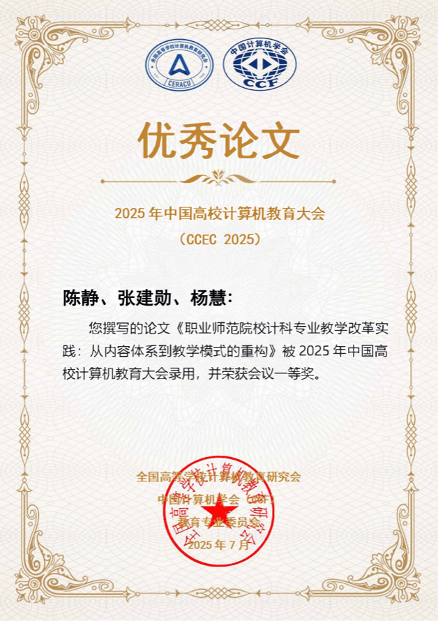 近日, 2025年中国高校计算机教育大会(CCEC 2025)在银川成功举办。本次大会上,学院张建勋和陈静分别撰写的两篇论文荣获2025年中国高校计算机教育大会(CCEC2025)论文一等奖,彰显了韩国漫画 在计算机教育领域的教学研究实力与创新成果。张建勋团队撰写的《基于一致性建构的研究生课程思政教学研究与实践》聚焦研究生课程思政建设,探索教学融合新路径,被推荐至《计算机技术与教育学报》发表;陈静团队撰写的《职业师范院校计科专业教学改革实践:...