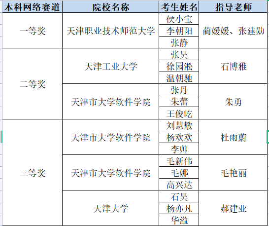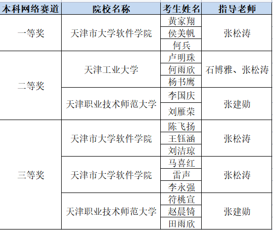 的4支队伍分别角逐网络赛道和云赛道全国总决赛的入场券。信息学子侯小宝、李朝阳和张静团队获得天津赛区云赛道的总冠军,成功晋级全国总决赛。指导教师蔺媛媛、张建勋。此外,网络赛道的李国庆、刘雁荣团队获得天津赛区二等奖,符桃宣、赵晨锜和田雨欣团队获得三等奖,指导教师均为张建勋老师。这是继全国大学生“C4网络技术挑战赛”决赛获得优异成绩后再获佳绩。