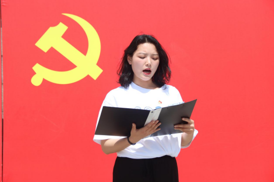 在广场上,全体党员面向党旗郑重进行入党宣誓。随后新党员何炜代表大家承诺:走好新时代的长征路,时刻以共产党员的标准来要求自己,争取早日成为正式党员。转正党员陈晓庆代表大家承诺:将积极参与到祖国的建设当中,做到“不忘初心一百载,建功立业新时代”。
