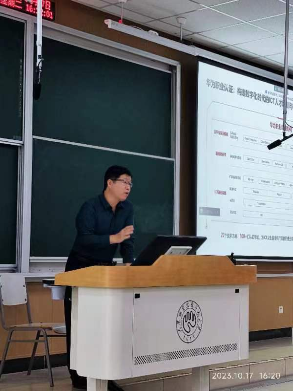 随后来自华为生态企业职业科技(天津)有限公司的张媛媛经理从职场规划及职场素养讲起,介绍了ICT行业的岗位分类及人才能力需求,以实际的案例激发同学们技能成才和科技报国的决心。