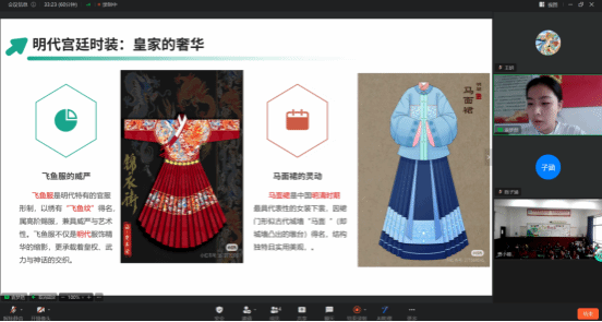 随后,课程走进了明朝。实践团袁梦然拿出“飞鱼服”的图片,告诉孩子们这是明代高阶官员的赐服,衣上绣着的“飞鱼纹”威风凛凛,既代表皇权的威严,又充满艺术美感,是权力与神话的巧妙结合。而女性的“马面裙”则更贴近生活——裙子的门襟形似古代城墙的“马面”,独特的结构让它既实用又美观,即便在现代,马面裙的设计依然被时尚界追捧,孩子们惊叹于古人的审美竟能跨越时空。